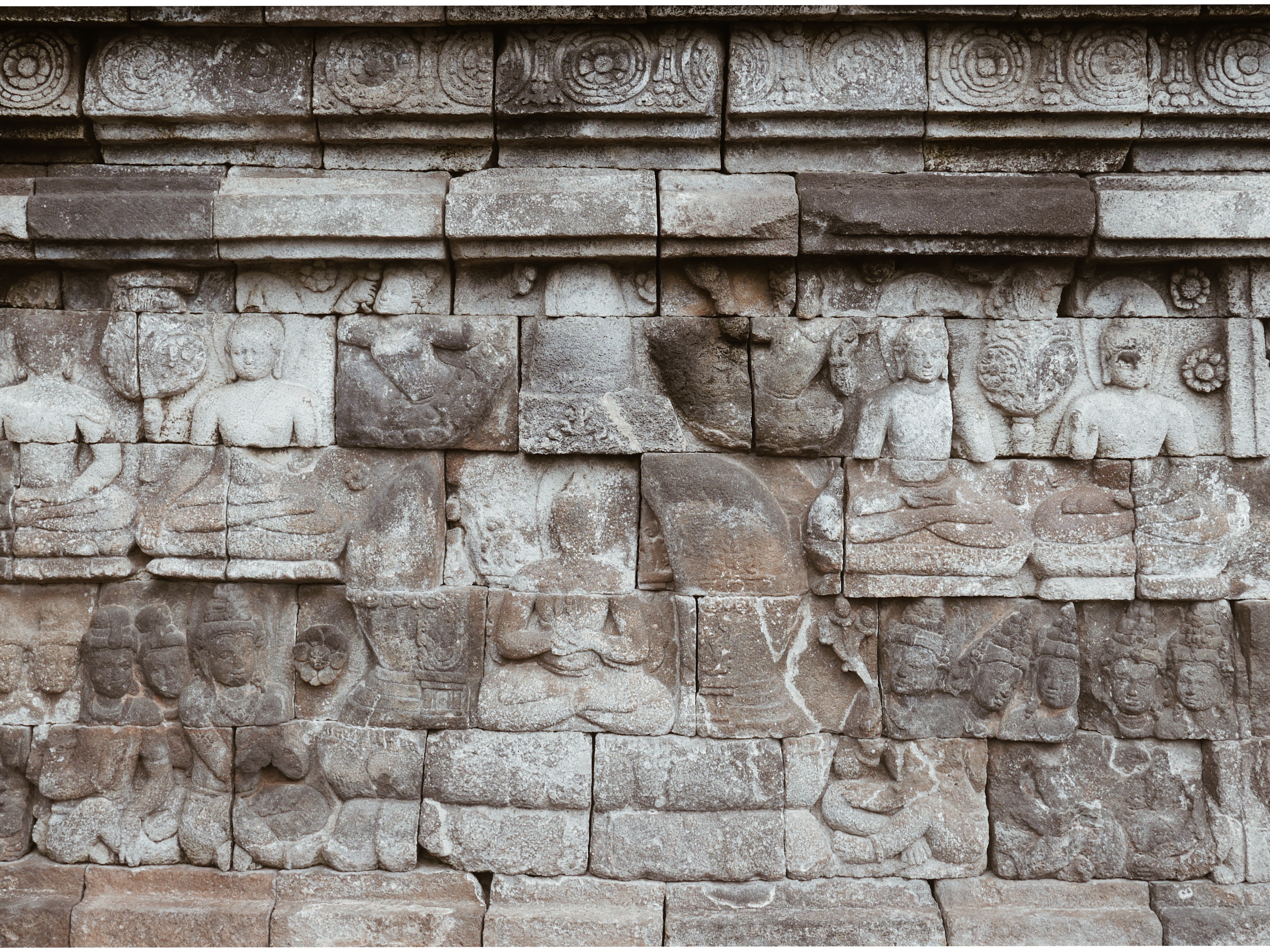 Borobudur consists of 9 stacked platforms and is topped by a central dome. The temple contains over 2,600 individual bas-reliefs, which cover the facades and balustrades. There are a total of 1,460 narrative panels in the galleries, and hidden foot of the temple, depicting stories of Sudhana, Manohara, Karmavibhangga, Lalitavistara, Jataka, and Gandavyuha. All of them are Buddhist sutras and seriously, it would take years to complete the temple by examining all of these panels carefully.