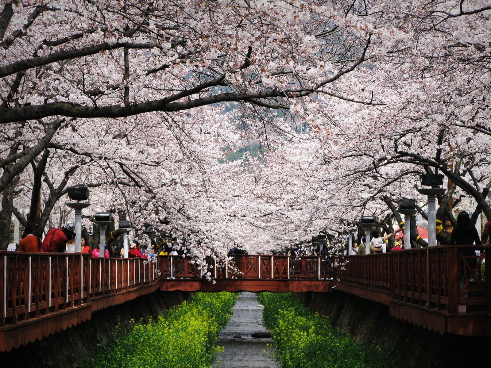 I saw the beautiful pictures on travel websites and found this breathtaking stream called Yeojwacheon. The Yeojwacheon Stream’s Wooden Walkway offers a unique view of the cherry blossom on top and canola flowers at the bottom along the stream. Taking photos in the middle of the footbridge across the stream, the far end is just perfect as a vanishing point of the photo, and that’s where I headed straight away once I got off the bus in Jinhae.