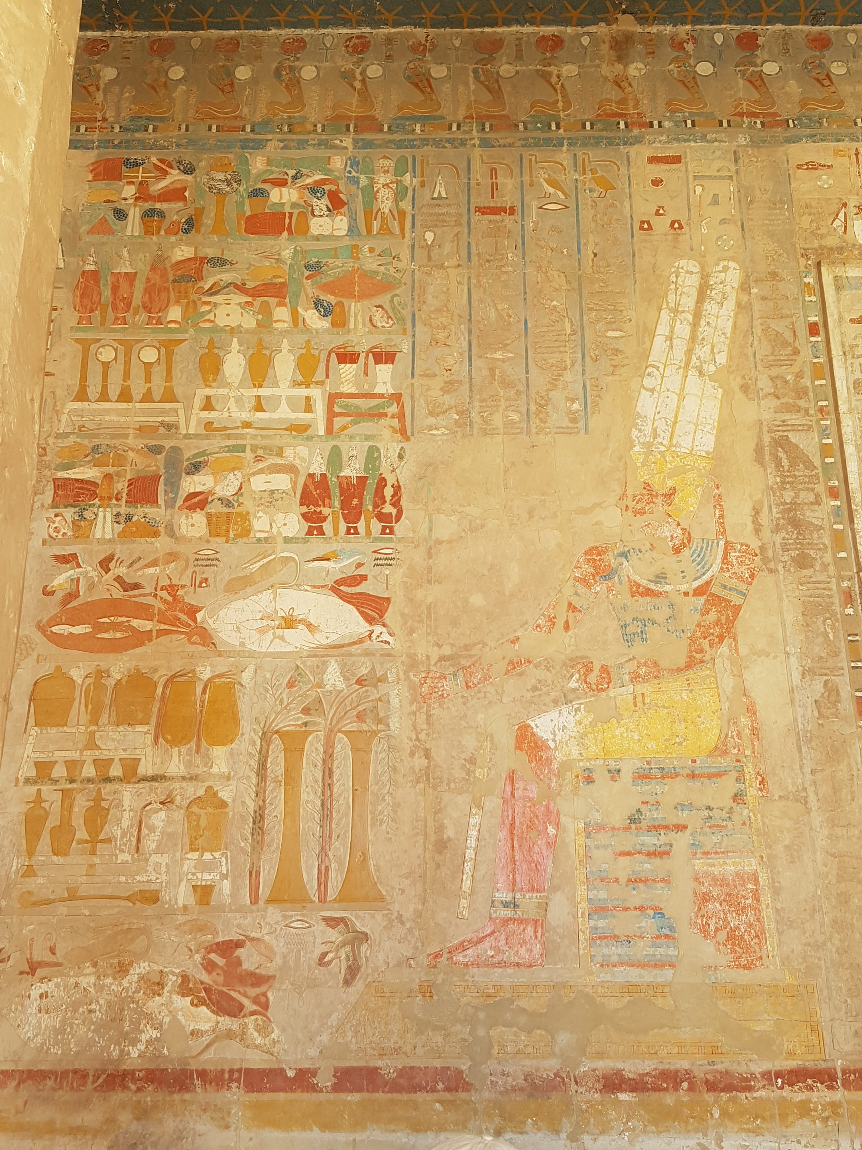 It was a separate temple from the Ipet-Sut by Seti I, where Amun met with the Ennead during the annual festival. The Hypostyle Hall is described in the texts inscribed in the architraves as a “temple of millions of years”, in association with the cult of Amun, which was celebrated. The colored decoration on the inside portrays the ceremonies carried out here, such as the sacred Barque festival or the daily religious rituals, whereas the decoration on the outside walls portrays the military victories of Seti I on the north side and Ramesses II on the south side.